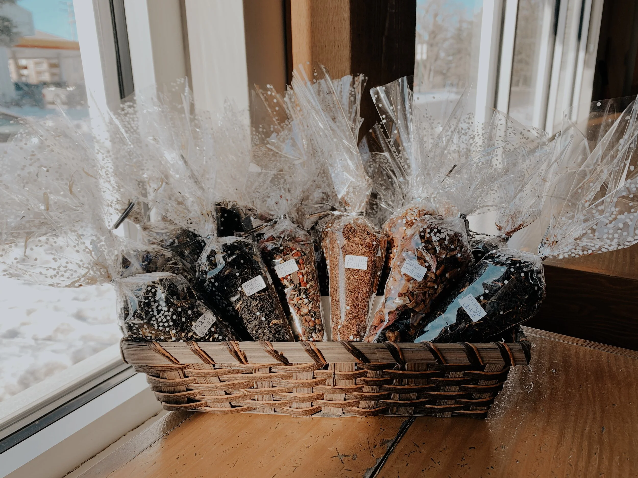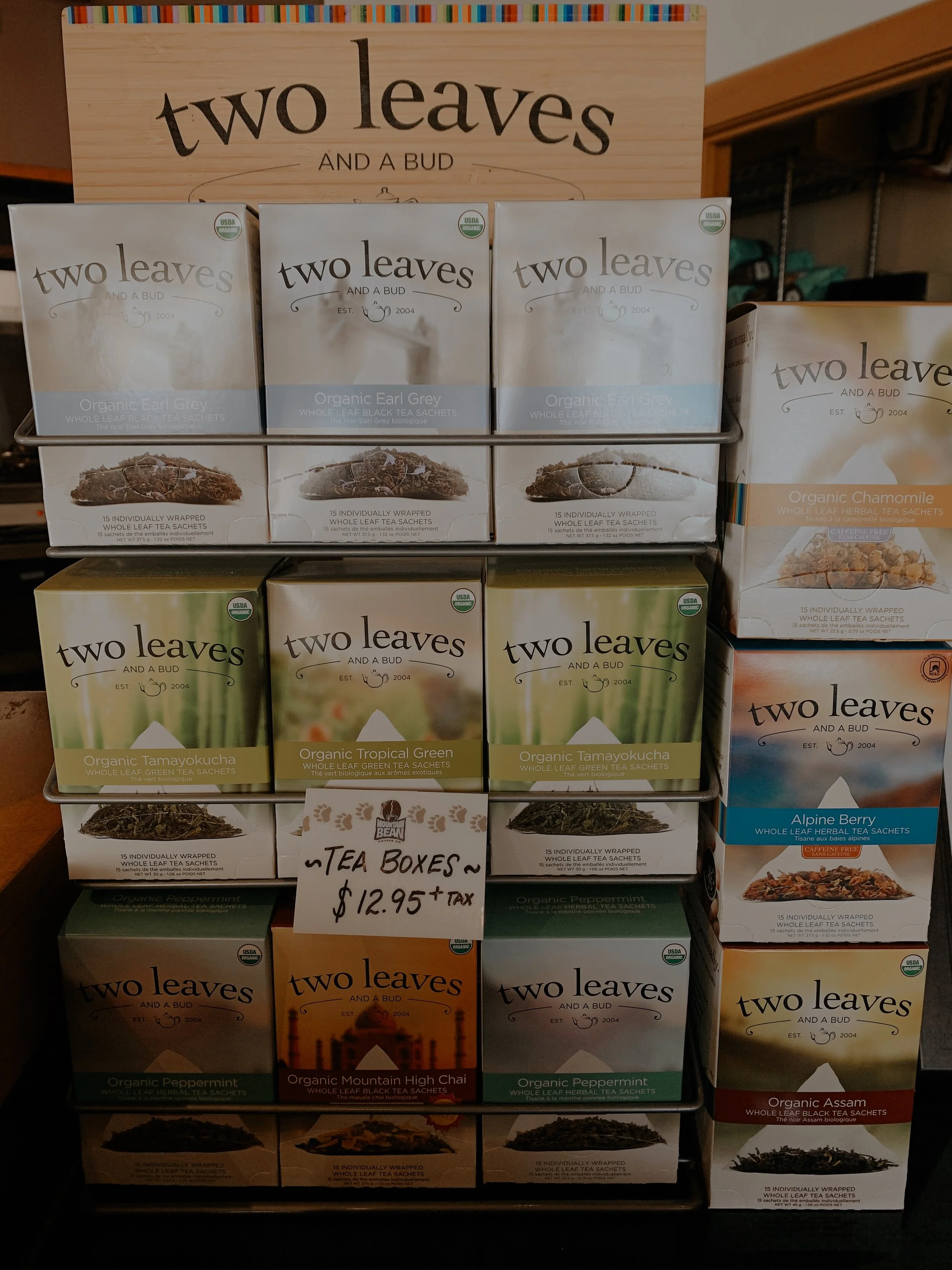 Take some of our favourites home with you. Candles: $I5/$24 - Magnets: $10 - Loose leaf Tea Cones: $4 - Tea Boxes: $I2.95 - Hoodie: $40 - Pottery Mugs: $40 - Cranked Energy Bar: $4 - Cards: $5 - Torani Syrups: $13.50